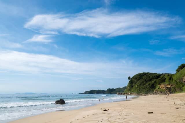 下田プリンスホテルの魅力のひとつが、マリンリゾート。ホテルの立つ高台から、ボードウォークの通路を下りて砂浜へと向かいます。ホテルの専用ビーチではありませんが、人気の白浜大浜海水浴場にくらべて人が少なく、プライベート感を味わえる浜辺です。
