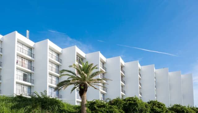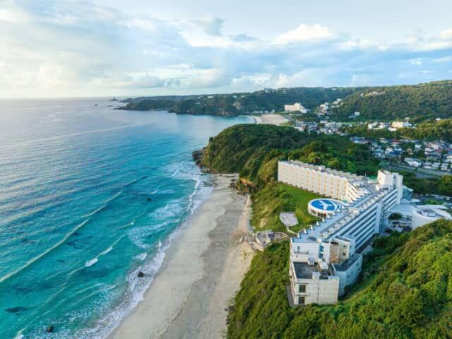 ▲浜辺から見上げた、緑と青空にはさまれた純白のホテル
