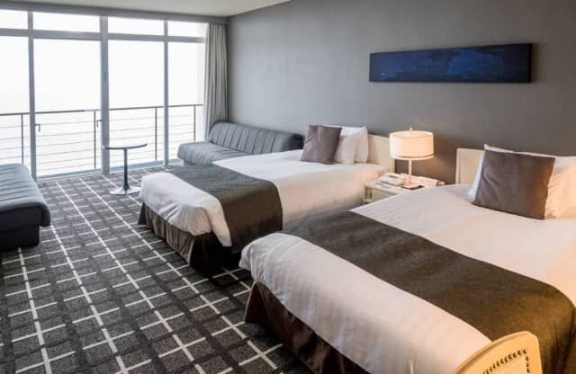 ホテル最上階の5階にある「ツインルームAタイプ」は、クルーズ船をイメージして上質で落ち着いたカラーを採用しています。120cm幅のセミダブルベットが2台置かれ、窓際にあるソファはソファベットとしても使えるため、4名まで泊まれます。