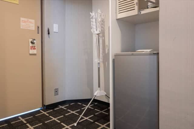 踏み込みにはクローゼットや水回りがまとめられ、中型サイズの冷蔵庫は連泊に便利です。また濡れた水着や大浴場で使ったタオルを干せるように、物干しスタンドも置かれています。