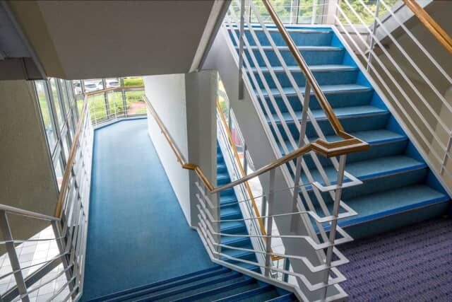 全面ガラス張りになった階段(スタッフはA階段と呼んでいます)のデザインも凝っていて、階によっては踊り場と廊下を合わせたような造りです。この個性的なデザインに惹かれ、ファッション誌などのモデル撮影に使われることもあるそうです。