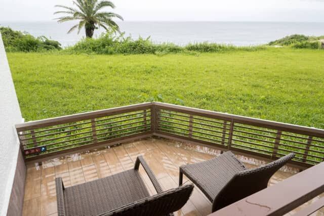 全ての各客室は、隣の部屋から見えないように段差をつけて配置され、ベランダから海を見ているときもプライベート感がまもられる設計です。