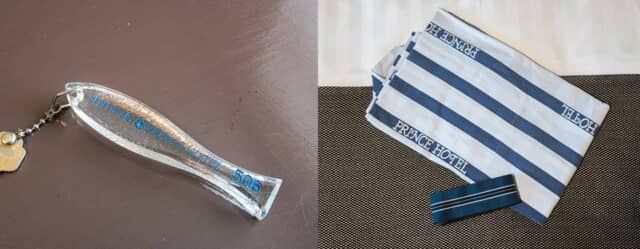 アクリル製の透明なスティック型キーホルダーは、懐かしいレトロなスタイル。海辺のホテルに合わせて魚の形になっています。部屋着には浴衣が用意され、プリンスホテルのロゴが入った、ちょっとモダンな縦縞を採用。着用は客室内と大浴場の行き帰りのみとなっています。
