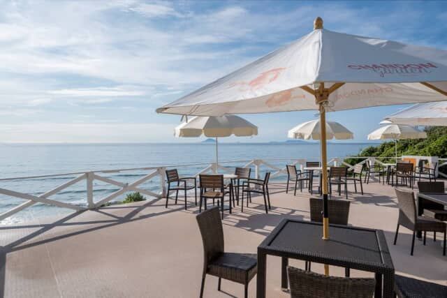 夏のテラスでは一般客も利用できるカフェをオープン。地中海のリゾート地を思わせる雰囲気で、ドリンクや食事を楽しめます。