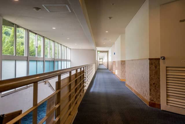 中央にあるエントランスから左右へ斜めに伸びる真っすぐな廊下。外側はアルミサッシの窓になっていますが、建築当初は窓がなく、マンションなどでよく見られる外廊下になっていて、外気を感じられる設計になっていました。