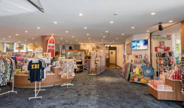 下田の有名サーフショップ「白浜マリーナ」の直営ショップで、マリングッズや水着、地元のお土産物などをそろえます。サーフィンスクールも開催します。