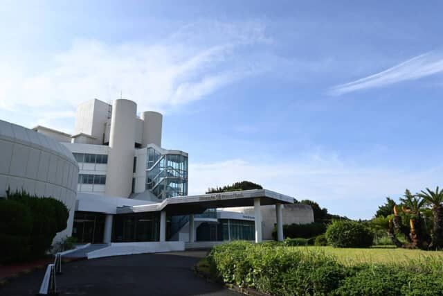 円筒形の建造物をくわえるのも黒川紀章らしい遊び心。場所は伊豆急下田駅から車で15分ほど。無料のシャトルバスのほか、路線バスも利用できます。