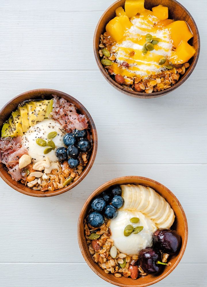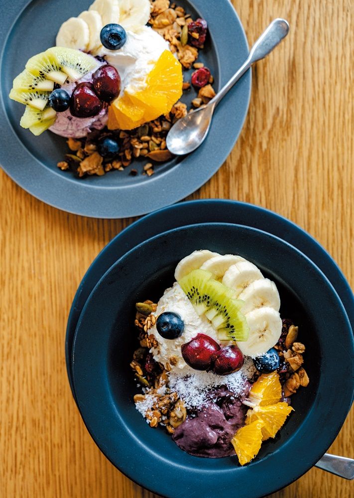 上・プレーンとブルーベリーのハーフ&ハーフのグリークヨーグルト120gをチョイスし、フレッシュフルーツとグラノーラをトッピングした「フルーツヨーグルトボウル」¥1,215。下・プレーン80gに、鉄分を多く含むアサイー、フレッシュフルーツ、グラノーラを合わせた「アサイーヨーグルトボウル」¥1,530。