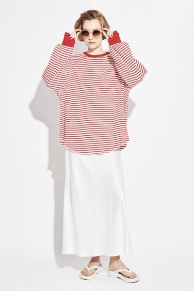 赤ボーダーロンT 4,950円/Ungrid スカート 31,900円/BEIGE,(オンワード樫山 お客様相談室) サングラス 3,850円/コントロールフリーク(キャセリーニ) サンダル 4,950円/Ipanema(シードコーポレーション)