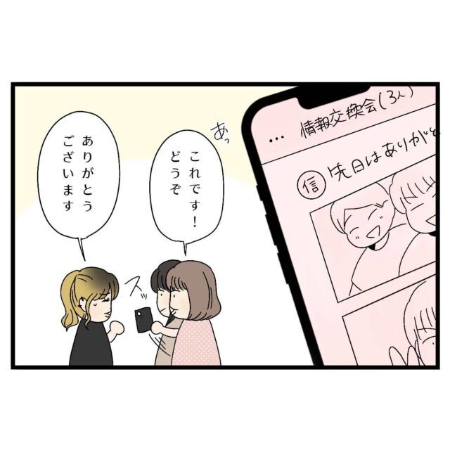 サチさんがママさん達に謝ると「いえいえ!最初は子ども達とたくさん遊んでくれたし・・写真も」と言われ「・・写真?」と疑問に思ったサチさんがスマホを見せてもらうと・・公園で遊んだ時の写真がたくさん!でも・・「アイコンが違う」ということに気づいたサチさんがかずくんママに電話をかけてくれるようにとお願いしたところ、「もしもし!かずくんママ、もしかして飲みに・・」とサチさんが聞いてるとも知らず、懲りもせずママさんを飲みに誘いました。