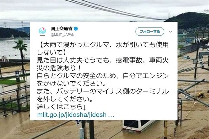 国土交通省のTwitterアカウントでは、「浸水・冠水被害を受けた車両のユーザーの方」へ向けて、以下の様に対処するよう呼びかけています。