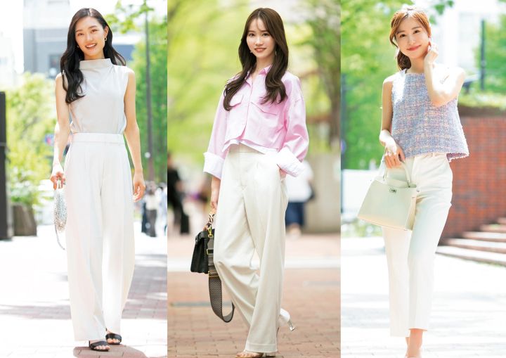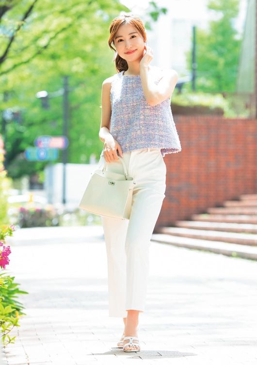 「白を基調とした女性らしいコーデは、きれいめ気分のおでかけにぴったり。白パンツは汚れることを加味してUNIQLOで買うことが多いかな。美脚ラインとアンクル丈で脚長効果にも期待◎。カラフルなトップスは淡い色みが大人可愛くてお気に入りです」(イメージコンサルタント/栂野ちひろさん・30歳)