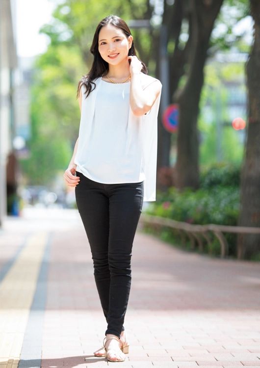 「ウルトラストレッチジーンズに、きれいめかつすっきり着られるトップスを合わせたシンプルなスタイル。気合いを入れすぎていない感じが友人との買い物などサクッとでかける日に◎。ストレッチが効いていて脚をきれいに見せてくれるので、色違いも持っています」(外資系金融IT会社勤務/水谷映里さん・29歳)