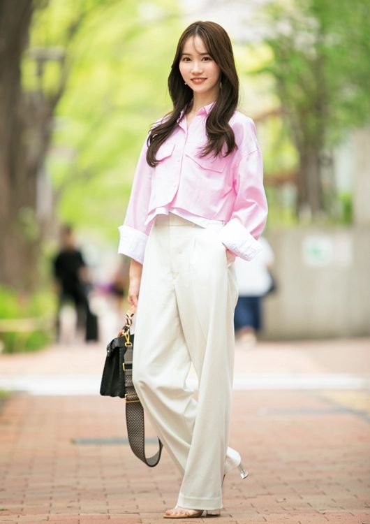 「UNIQLOの白のタックワイドパンツに淡いピンクのシャツを合わせて、爽やかなカラーコーデに♡ミニマルなサイズ感のトップスで今っぽさをIN。クリアヒールのサンダルで、夏ムードを盛り上げました。きれいめコーデだから、素敵なカフェに行きたいです」(法律事務所勤務/川原千里さん・24歳)