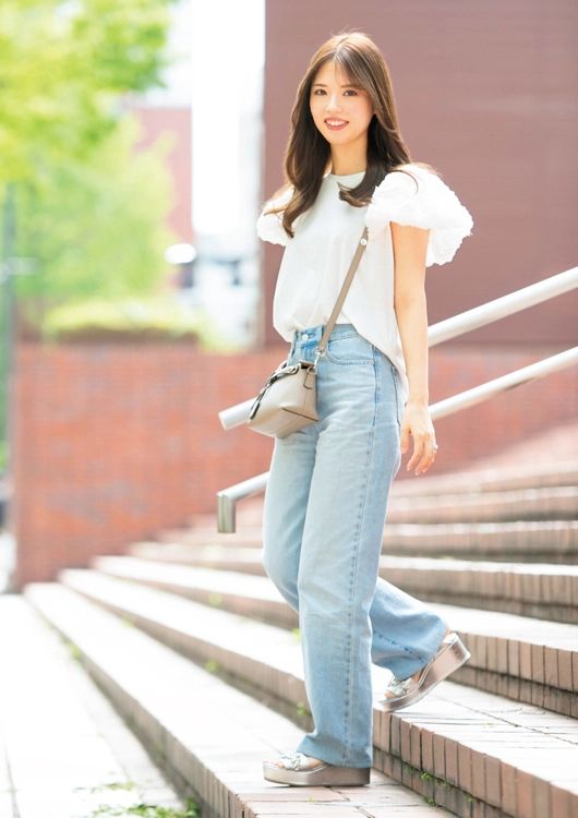 「UNIQLOのストレートデニムは、ハイウエストでスタイルアップを叶えてくれるお気に入りアイテムです。袖にフラワーがあしらわれた甘めトップスと合わせることで、甘カジュアルに仕上げました。夏っぽコーデが映えると思うので、ひまわり畑に行きたいです」(化粧品会社勤務/渡実月さん・32歳)