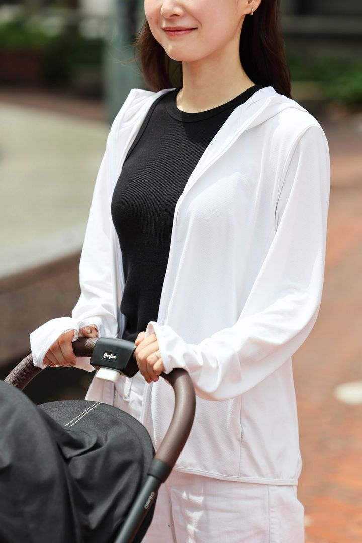 「UVパーカは夏のおでかけの必需品。バッグに必ず入れておいて、日差しが気になるときに着るようにしています。黒のほうがUV効果は高そうな気がしましたが、見た目が暑そうなので白をセレクト。袖に親指が通せる穴が開いているから、水に濡れて日焼け止めが取れてしまいがちな手の甲までしっかりガードできて便利です」古川香保さん・32歳(160㎝/1歳の男の子ママ)