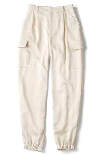 上品なツヤ感でエレガントに。カジュアルな イメージのカーゴパンツも淡色×サテン素材ならこんなに上品。