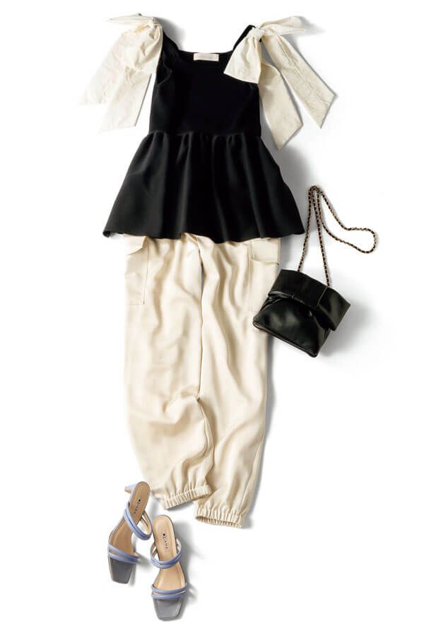 立体感のある肩回りのリボンがアイキャッチーなチュニック×今年顔なサテンカーゴでトレンド感全開に。寒色トーンのミュールで足元には美人感と抜け感もしっかりMIX。