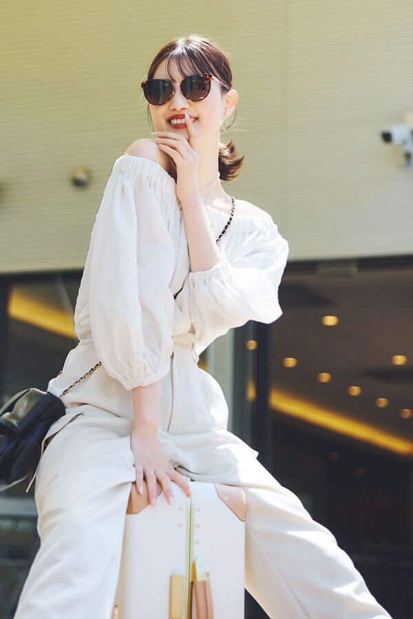 チェーンバッグの斜め掛けや、サングラスで爽やかなホワイトコーデにスパイスを。肩見せでヘルシーな可愛さもアピール♡