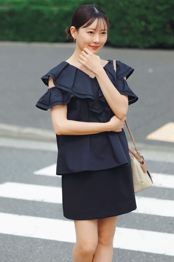 沈みがちな夏のALLブラックコーデを、Itなディテールでアップデート。ショーパンに抵抗がある人は、ショーパンが仕込まれたスカートタイプからトライしてみるのがオススメ。