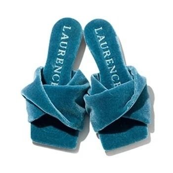 ブルーベロアサンダル/LAURENCE(ザ・グランドインク) 優しい履き心地を提供。存在感のあるツイストデザインで、街にもリゾートでも活躍。