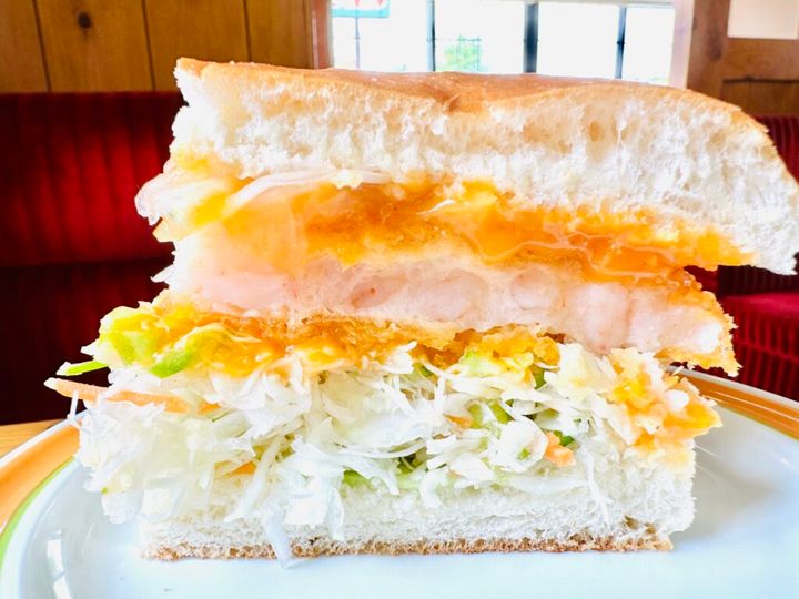 店員さんが近づくにつれてガーリックの香りが濃くなるほど、遠慮なしのガーリックシュリンプソース。外側がカリッ、中身はぷりぷりで、エビフライとはまったく異なる食感のエビカツが絶品です。キャベツの量は容赦なく、見たところ断面の高さは約7~8センチはありそう。アイスコーヒーにもビールにも合いそうなパンチのあるフレーバーで、大満足できること間違いなしです。