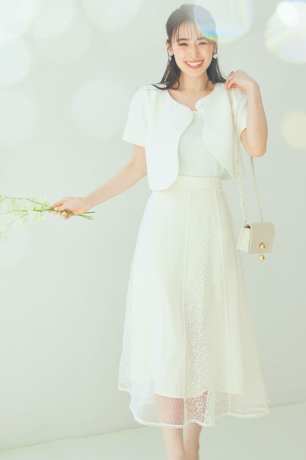 スカートは2種類の繊細なレースを組み合わせたデザイン。フロントのやわらかなカーブがおしゃれなジャケット合わせればお利口になりすぎず、洗練度アップ。