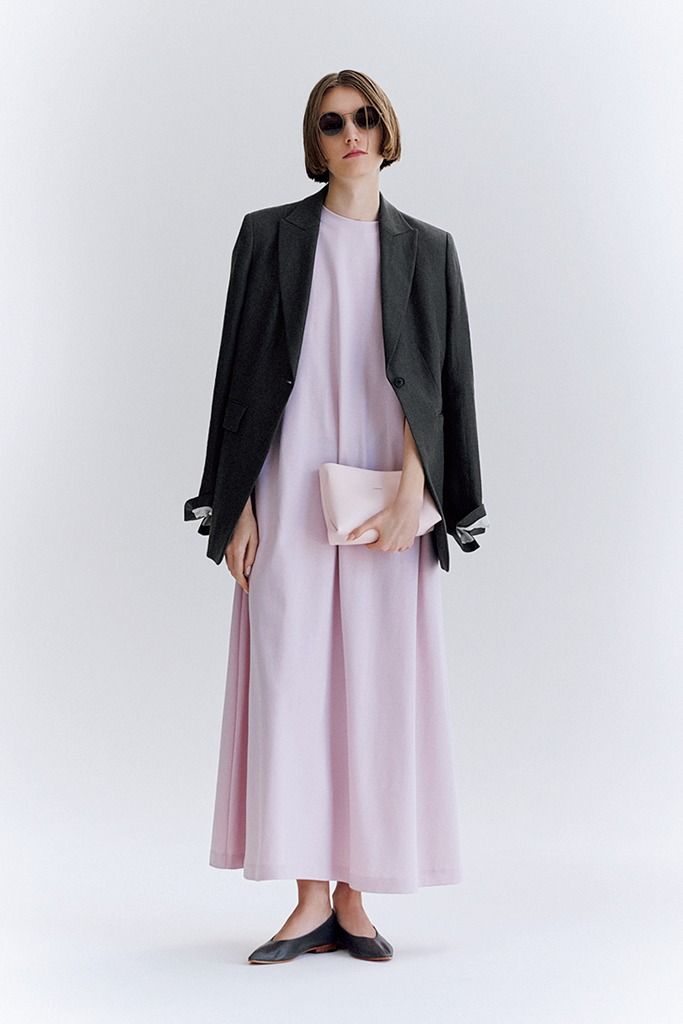 やさしいパステルカラーは黒で強さを出すよりも「やさしく引き締める」のがバランスよくとり入れるコツ。そこで起用したいのがグレーやネイビー、ブラウン。ピンクなど甘い色も黒に近いグレーと一緒にクールに装うことで、ガーリーに転ぶ心配は不要。 グレージャケット/BEIGE, ピンクノースリーブワンピース/ebure(ebure GINZA SIX 店)