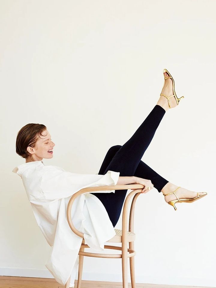 サンダルははきまわし。 ほっそりとしたスキニーパンツの先にアクセ代わりのゴールドを。脚線の中で一番細いポイントに光を集めることで、下手に盛らずとも細さをアピールできる。ぴったりしたすそから足先までのよどみのない直線シルエットも、細ストラップのサンダルならでは。
