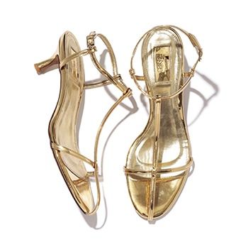 サンダル(5) 12,100円/ル タロン グリーズ(ル タロン グリーズ ルミネ新宿店) 華やかな雰囲気をかもすゴールドは、その細さのおかげでベージュのように肌なじみがよく、どんな色のボトムともケンカしない色。ソックスを重ねてももたつきにくく、歩きやすい安定感のあるアンクルストラップつき。
