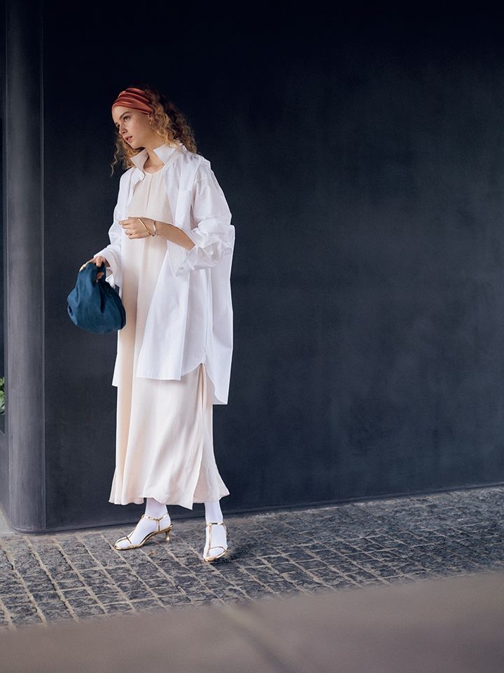 サンダルははきまわし。 フレアスカートの広がるすそにも重くない、ソックス合わせ。肌を覆い隠す白があることで自然と清潔感が生まれ、ゆれるすそも華美になりすぎない。サンダルに合わせて、手元や顔まわりなど、要所にもゴールドをちりばめると、中和したテイストがわずかにキレイめよりに。