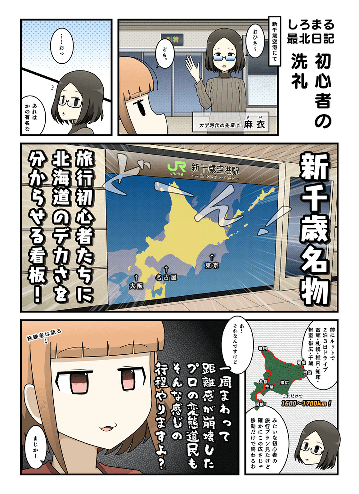 新千歳空港名物「北海道の広さわからせ看板」!旅行者と移住者それぞれが語る、北海道の楽しみ方|しろまる最北日記vol,25【漫画】