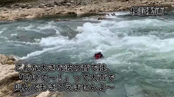 今回はライフジャケットとヘルメットを着用した状態で検証しているので安全が保たれていますが、 もしライフジャケットがなければ水面下に引き込まれて浮上できない可能性も十分あり得ますし、早い流れに飲まれて川底や岩、石などに頭をぶつけてしまえば大怪我に繋がることは間違いありません。