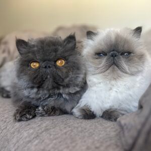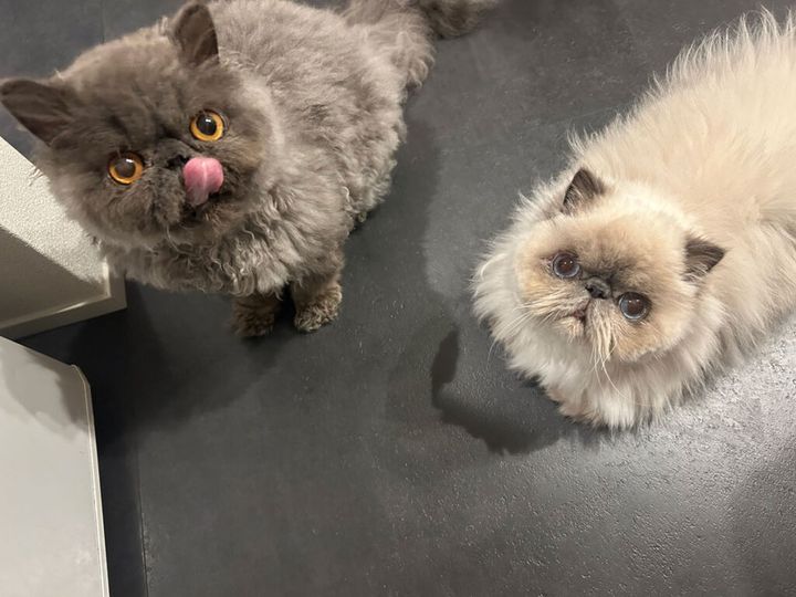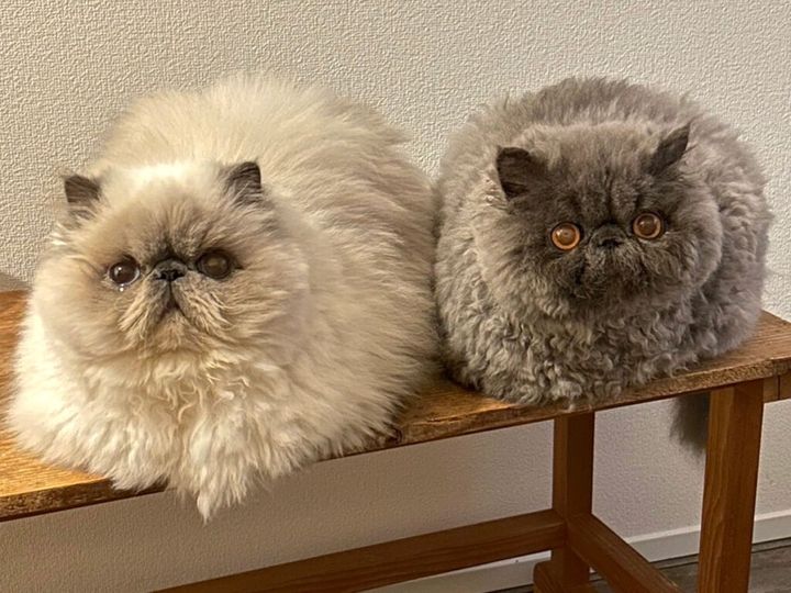 ねこ(左)「この写真はぼくらのお気に入り」こねこ(右)「ぼくたちもふもふしててかわいいでしょ? 気づいたら同じポーズしてたぞ。シンクロだぞ!」ねこ・こねこ「もしかして……、これがモ・レ・ル?」