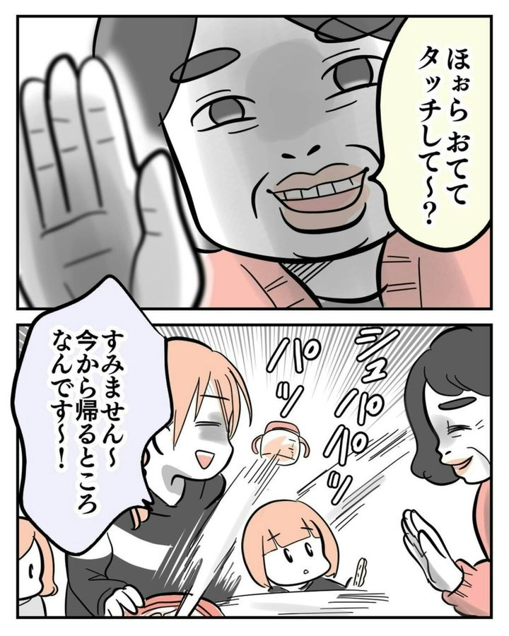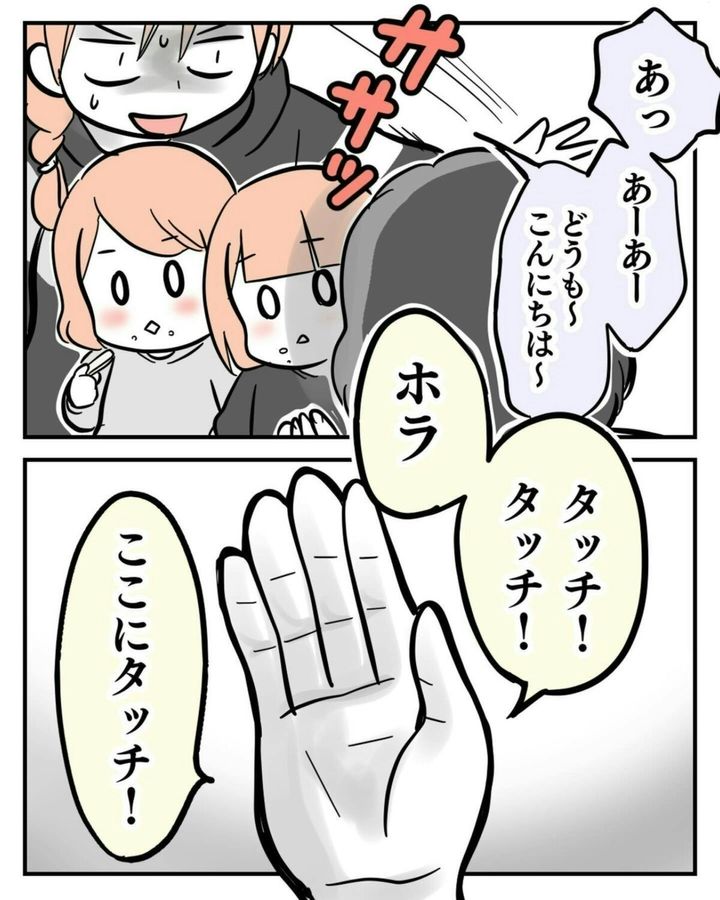 年齢的に人見知りの時期もあり、子どもが怖い思いをすることもあります。親の存在を無視するようなハイタッチおばさんに、サヤ山サヤさんは警戒をします。もし皆さんが同じような経験をしたらどうしますか?