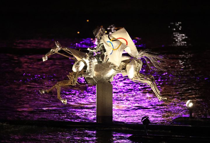 選手たちが入場を終えると、オリンピックフラッグを纏った騎手を乗せたシルバーの馬がセーヌ川を疾走。その姿はフランスの国民的ヒロインであるジャンヌ・ダルクをイメージしているようにも見えた。