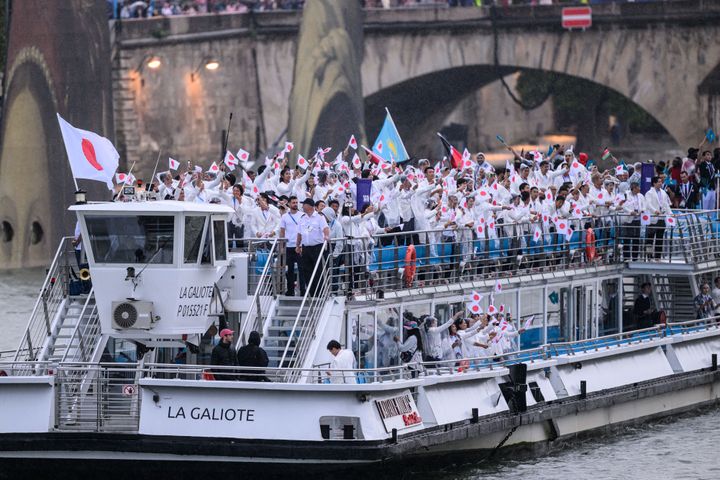 雨が徐々に強くなる中で行われた選手団のパレード。日本の選手180人を乗せた船は93番目に登場した。旗手を務めたのは、パリ大会からの新競技となるブレイキンのShigekix(半井重幸)とフェンシングの江村美咲。