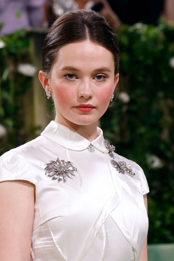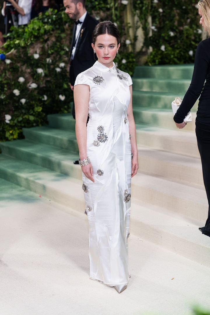 初参加した2024年のメットガラでは、アンバサダーを務めるミュウミュウのドレスをまとって。アイキャッチーなメタリックの3Dフラワー装飾、キャップスリーブと小さな丸襟がクラシカル&キュートな雰囲気です。