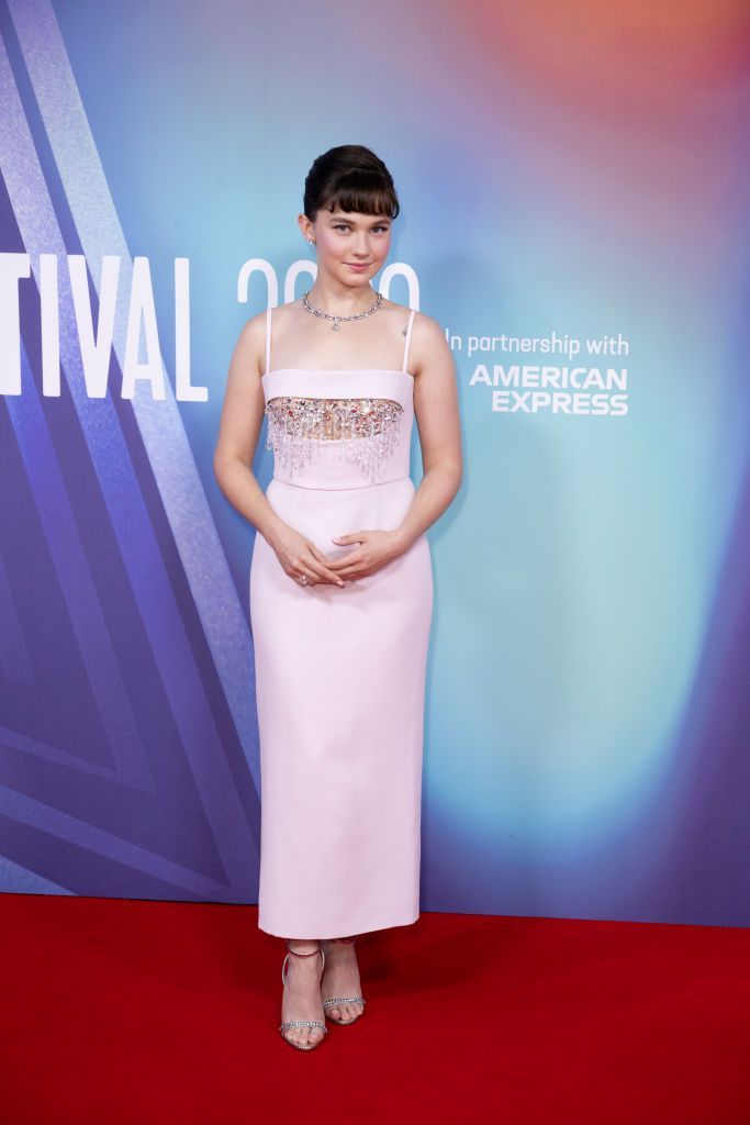 胸元のシルバーのスパンコール、クリスタルのフリンジがジュエリーのように輝くミュウミュウのドレス。'60年代を感じさせるアップヘアがドレス姿にモード感を与えてします。2023年のロンドン国際映画祭より。