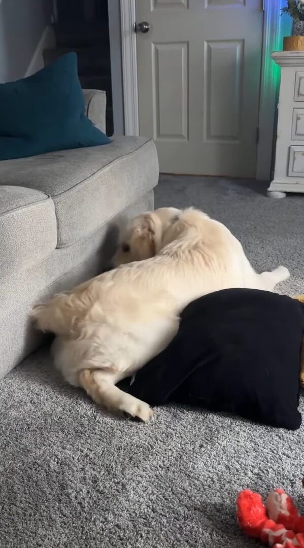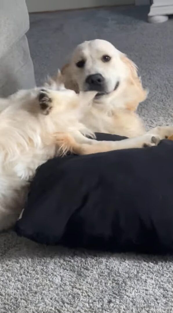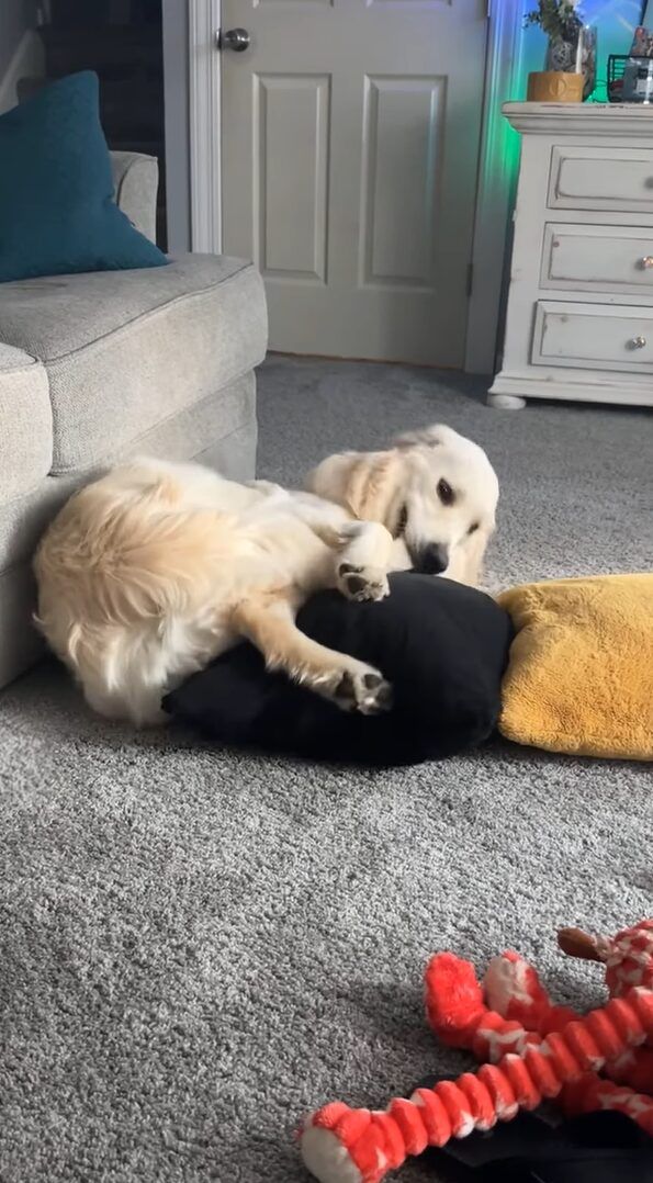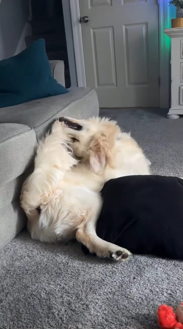 しっぽをオモチャにして遊ぶゴールデンレトリバー。 その様子は、こちらの動画からご覧いただけます!