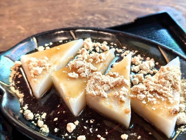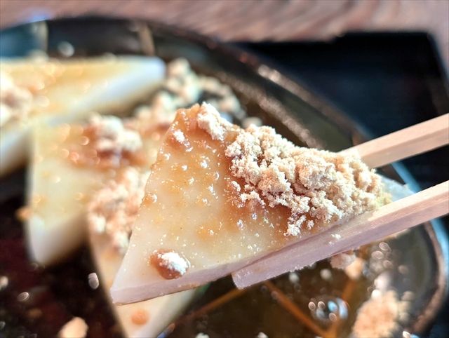 ぷるぷるともちもちが合わさった、ぷるもち食感に、香り高いきな粉と優しい赤蜜の甘さが広がります。くず餅はお店によっては酸味がありますが、こちらはなく、食べやすいです。