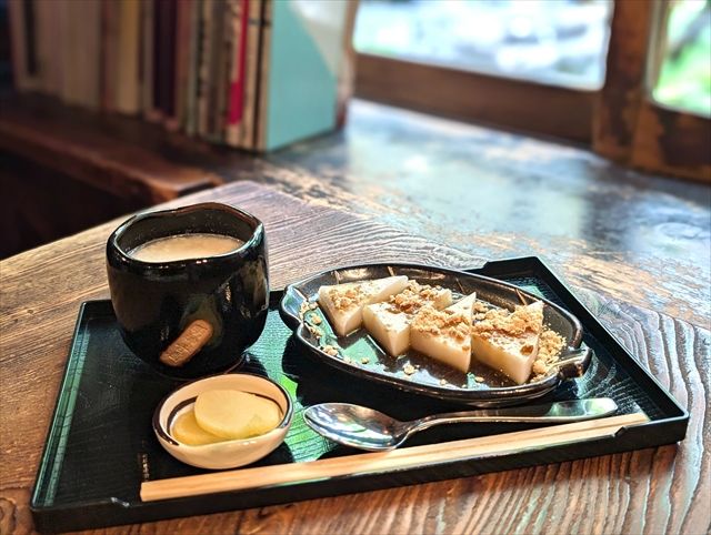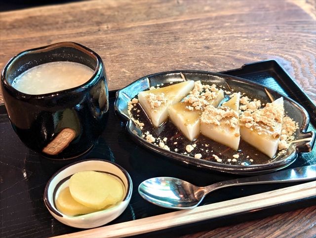人気のメニューがこちらの甘酒とくず餅のセット。甘酒にくず餅が4つ、備え付けの沢庵のセットです。備え付けは店内で販売しているものを日替わりで出しているとのこと。