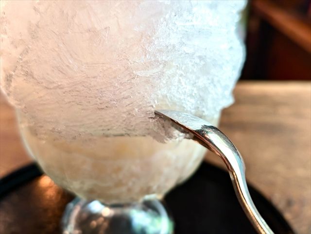 氷が口の中ですぐに溶け、ひんやりとした甘酒が。糀の味わいや甘みも十分に感じられ、甘酒ならではのふにゃっとした食感も楽しめます。