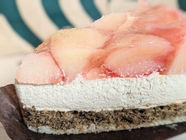 公式サイトによると、大きくカットした白桃とゼリー、なめらかなアールグレイムース、しっとりとしたアールグレイ生地、ざくざく食感のクランブルを重ねたケーキ。