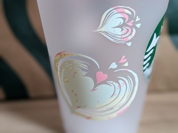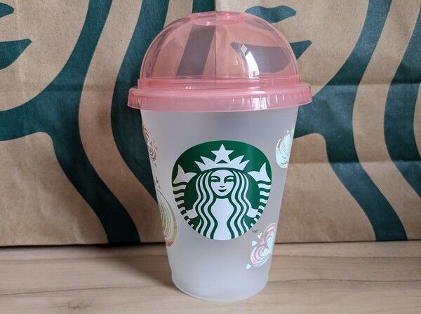 新作の「ドームリッドリユーザブルコールドカップマーブルハート473ml」です。洗って繰り返し使用できるカップ。ホット・アイスどちらも使用可能です。フラペチーノにも使うことができます。ハート型のかわいいデザインが女性に大人気!リユーザブルカップを持参すると、22円(持ち帰り時は21円)値引きされるので、お店をよく利用される方におすすめです。