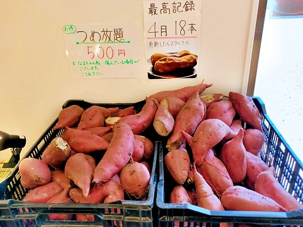 そして、入口付近には『つめ放題』の文字と共に、山盛りのさつまいもを発見! 大きすぎるもの、小さすぎるもの、形の悪いものなどいろいろ混ざっていますが、透明なビニール袋を500円で購入したら、あとは腕次第?!(笑)