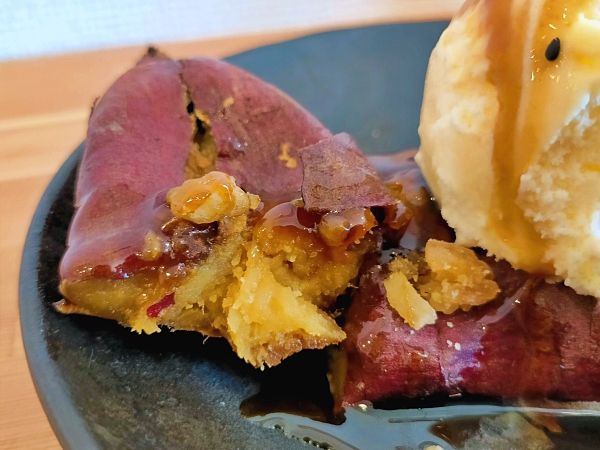 焼き芋と一緒に、口の中でとけていくミルキーなアイス、そこに時々、トッピングされた芋けんぴのザクザク食感も加わります。 隠し味の岩塩トッピングも効いていて、楽しく完食しました。