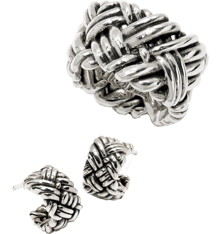 ピアス¥68,200、リング¥144,100(共にボッテガ・ヴェネタ/ボッテガ・ヴェネタ ジャパン)