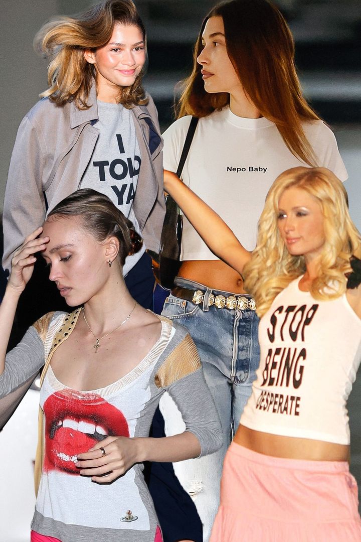 昨年、『ニューヨーク・マガジン』誌に父親のスティーヴン・ボールドウィンだけでなく、夫のジャスティン・ビーバーの恩恵も受けている「ダブル・ネポ」と揶揄されたヘイリー・ビーバーは、後日「ネポベイビー(2世セレブ)」と書かれたTシャツを颯爽と纏い、メディアに対して静かに反撃。また、最近ではジョナサン・アンダーソンルカ・グァダニーノ監督作品『チャレンジャーズ』(2024年)のために手がけたロエベLOEWE)の「I Told Ya」Tシャツが話題を呼んだ。劇中だけでなく、プレスツアー中もキャストたちが着用したその大胆なデザインの1枚は、度々完売する人気スタイルとなっている。