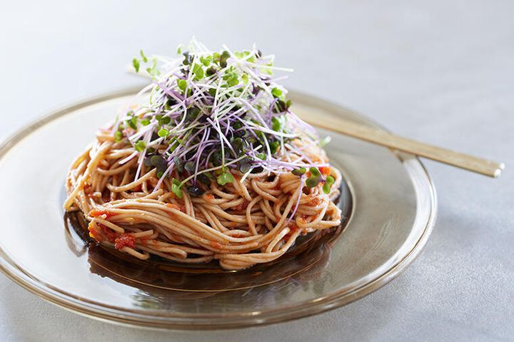麺つゆいらずのおそばアレンジレシピです。発酵トマトペースト・サルチャの酸味と深い旨味が、そばの風味と相性抜群!お好みのマイクロハーブやスプラウトをのせて、サラダ仕立ての夏の清涼感ある一品に。体がホッとする発酵食品を取り入れたレシピを、料理研究家の真藤舞衣子さんに教えてもらいました。